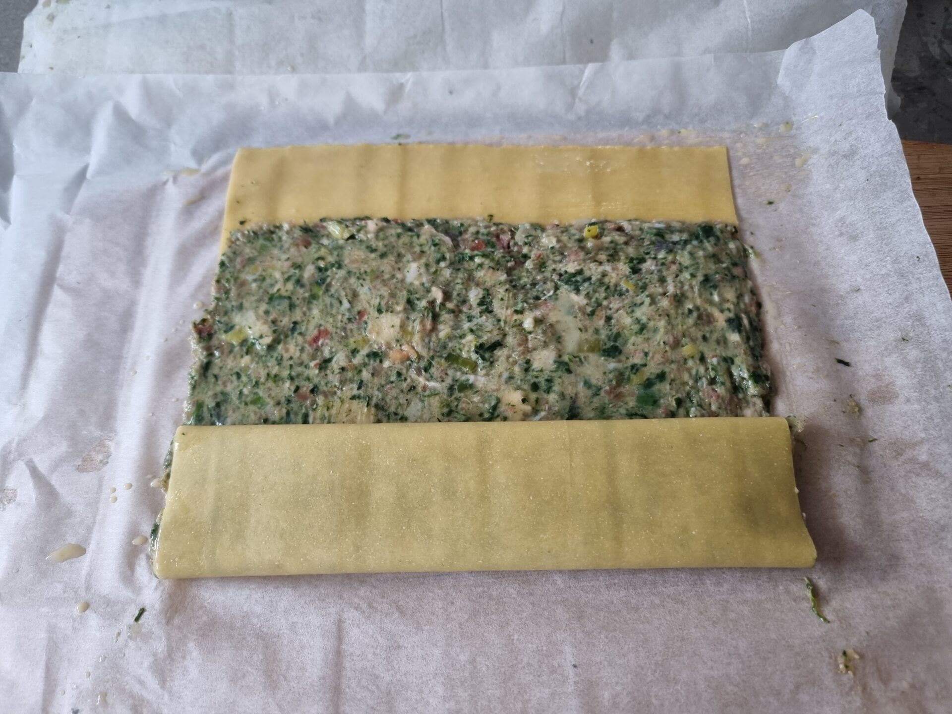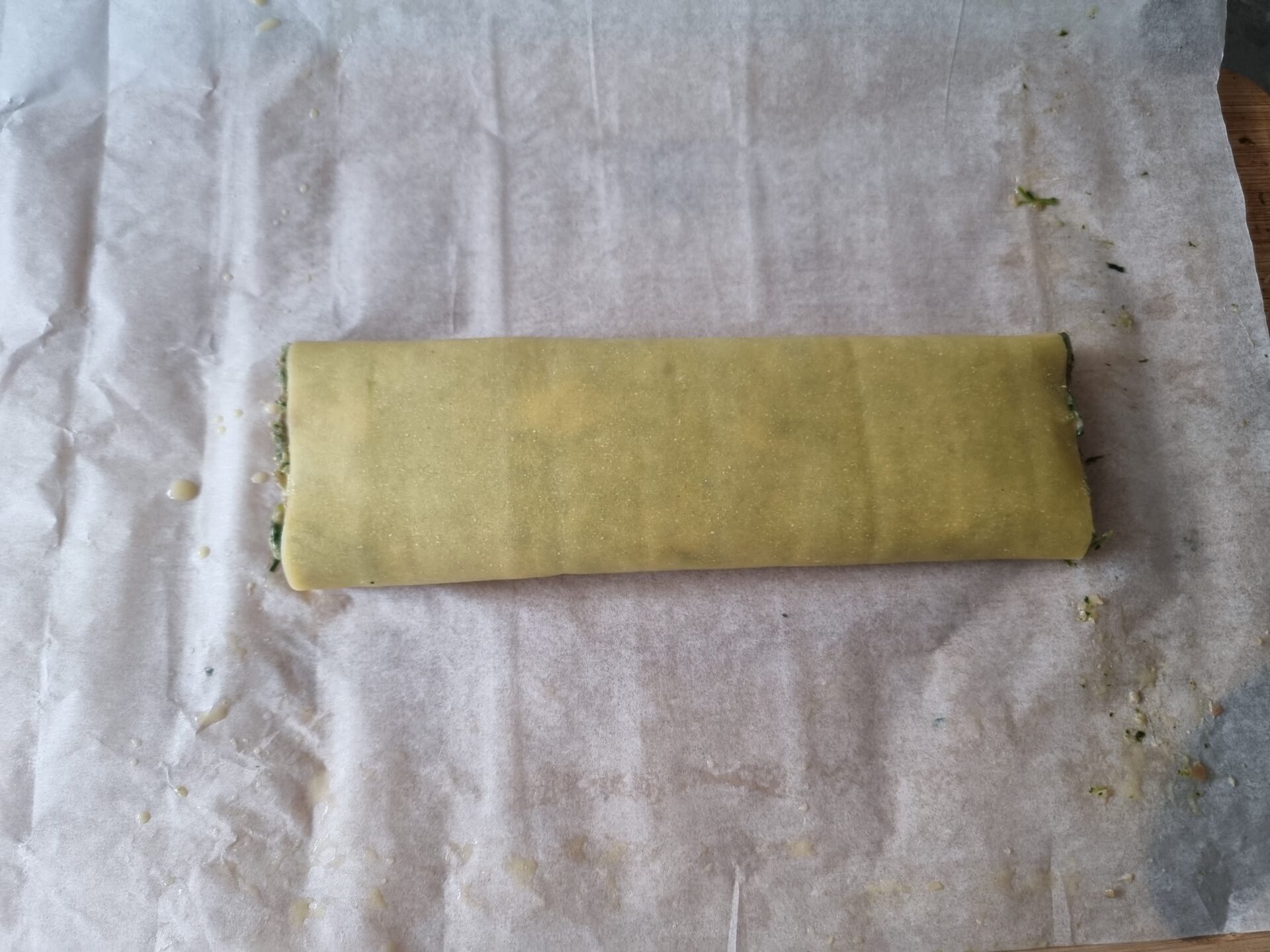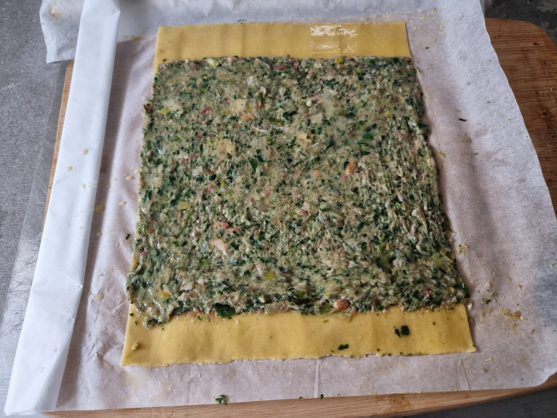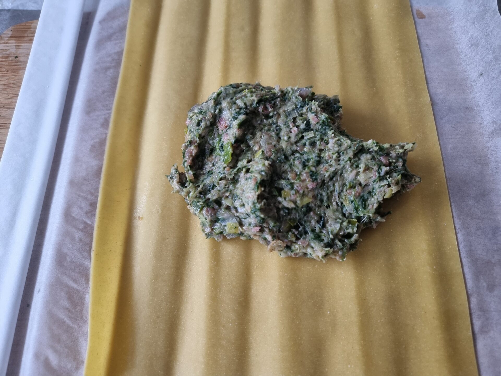 • Nudelteig auf einem großen Brett ausrollen und abschneiden. Die Füllung darauf dünn verteilen, dabei vorne und am Ende Platz lassen, siehe Bebilderung. Diese freien Streifen mit der Eistreiche einpinseln und vorsichtig aufrollen. Maultaschen mit einem scharfen Messer einteilen und durchschneiden.