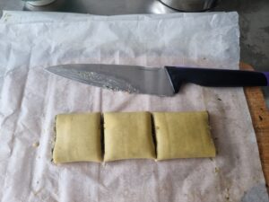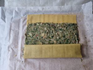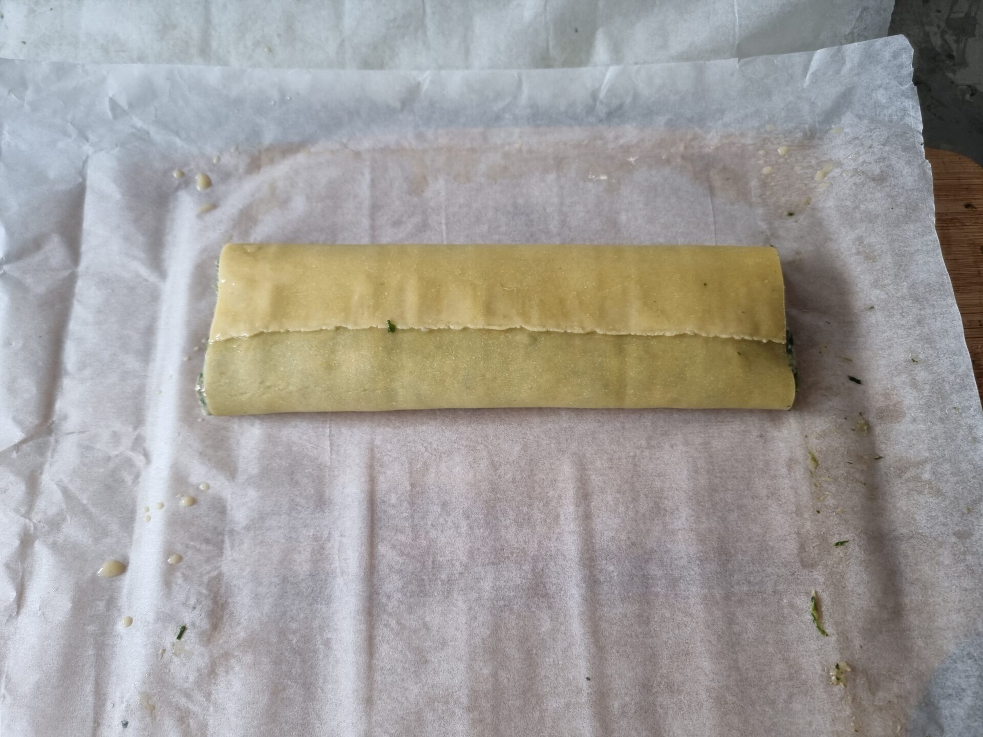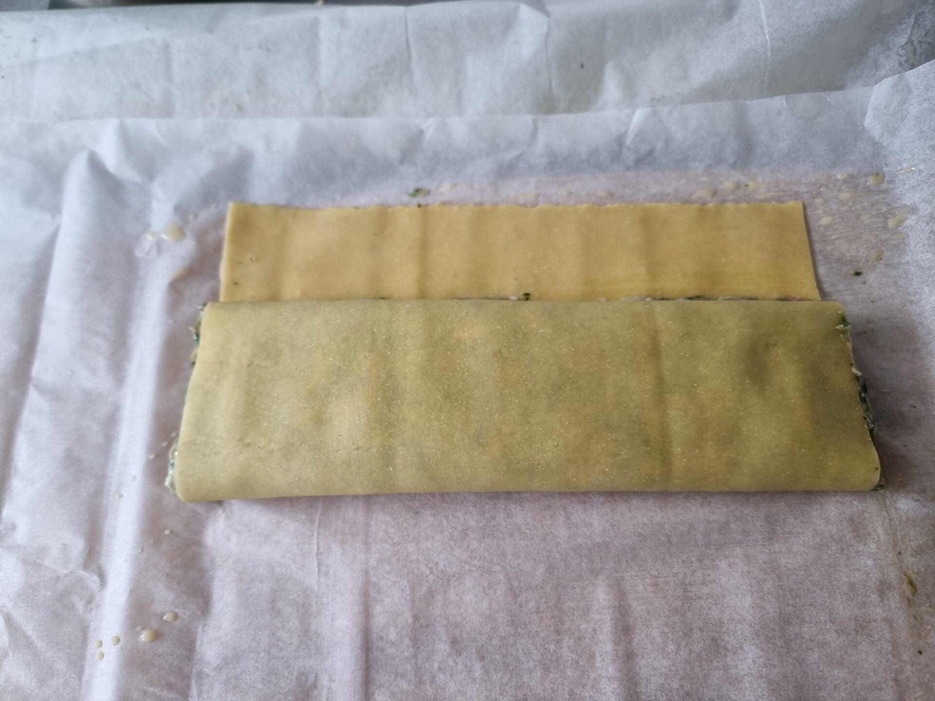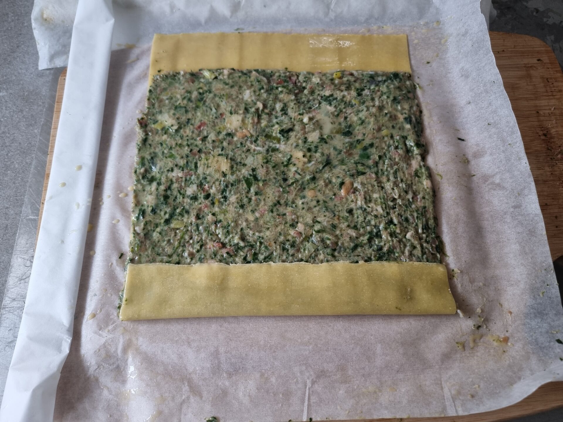 • Nudelteig auf einem großen Brett ausrollen und abschneiden. Die Füllung darauf dünn verteilen, dabei vorne und am Ende Platz lassen, siehe Bebilderung. Diese freien Streifen mit der Eistreiche einpinseln und vorsichtig aufrollen. Maultaschen mit einem scharfen Messer einteilen und durchschneiden.