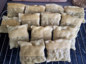 • Maultaschen im leicht siedenden Wasser gar ziehen lassen. Das dauert ca. 14 -15 Minuten. Mit einer Schaumkelle entnehmen und auf einem Gitter abtropfen lassen. So weiter verfahren bis der Nudelteig und die Füllung aufgebraucht sind.
